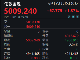 【大河财立方消息】2月4日,截至发稿,现货黄金重新站上5000美元/盎司,日内上涨1.37%,报5009.240美元/股。