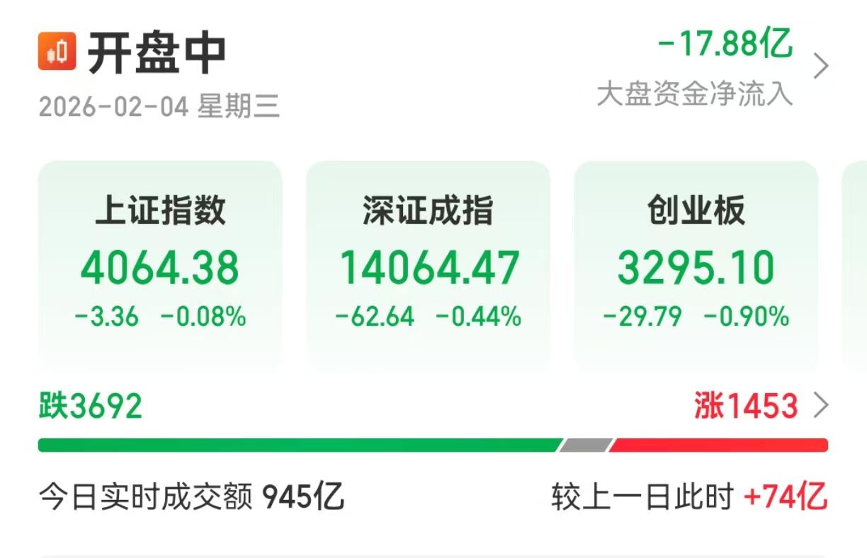 【大河财立方消息】2月4日,A股三大指数集体低开,沪指低开0.08%,深成指低开0.44%,创业板指低开0.90%,存储器、游戏、玻纤等板块指数跌幅居前。沪深京三市下跌个股超3600只。