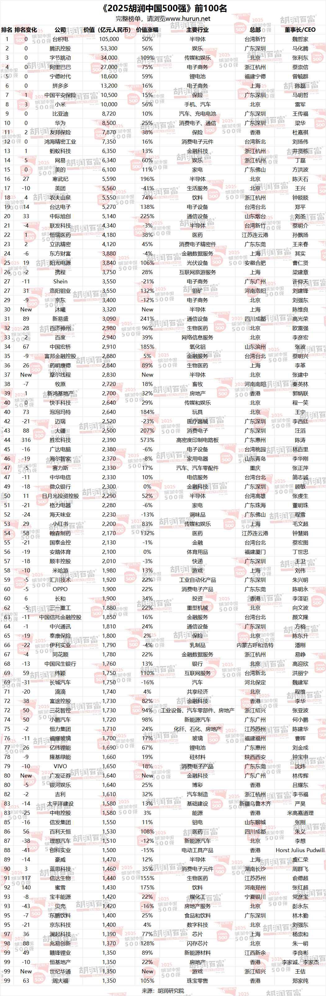 【大河财立方消息】2月5日,胡润研究院发布《2025胡润中国500强》,列出了中国500强非国有企业,按照企业价值进行排名。