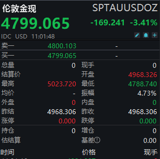 【大河财立方消息】2月5日,现货黄金跌破4800美元/盎司,日内跌超3%。现货白银暴跌超13%,现报76.815美元/盎司。