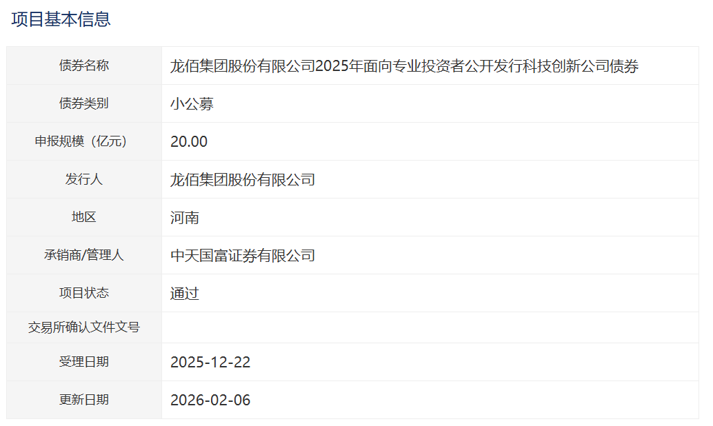 【大河财立方消息】2月7日消息,龙佰集团股份有限公司2025年面向专业投资者公开发行科技创新公司债券项目获深交所通过。本期债券拟发行金额20亿元,承销商/管理人为中天国富证券。