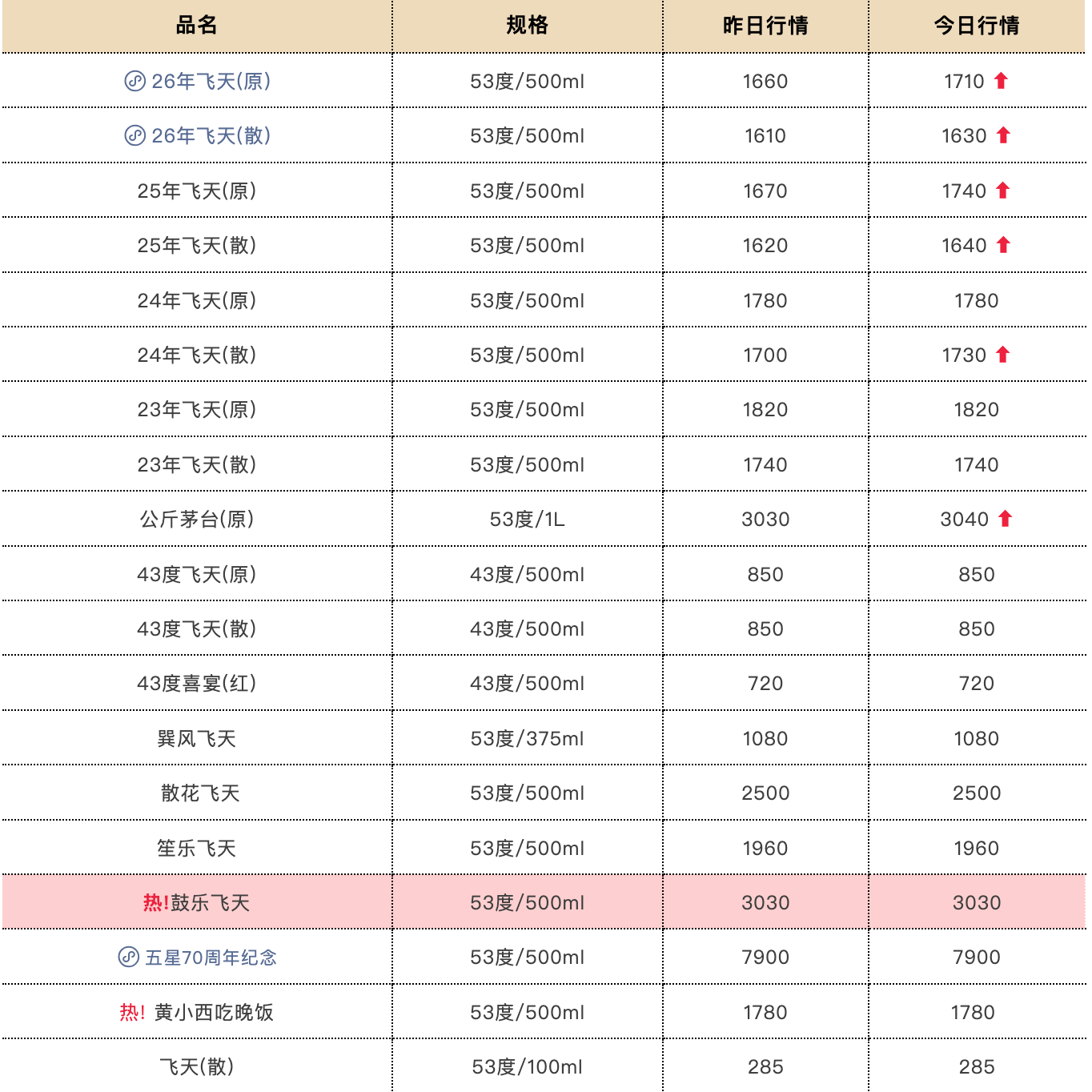 其中,26年飞天茅台原箱较前一日上涨50元,报1710元/瓶;26年飞天茅台散瓶较前一日上涨20元,报1630元/瓶。25年飞天茅台原箱较前一日上涨70元,报1740元/瓶;25年飞天茅台散瓶较前一日上涨20元,报1640元/瓶。