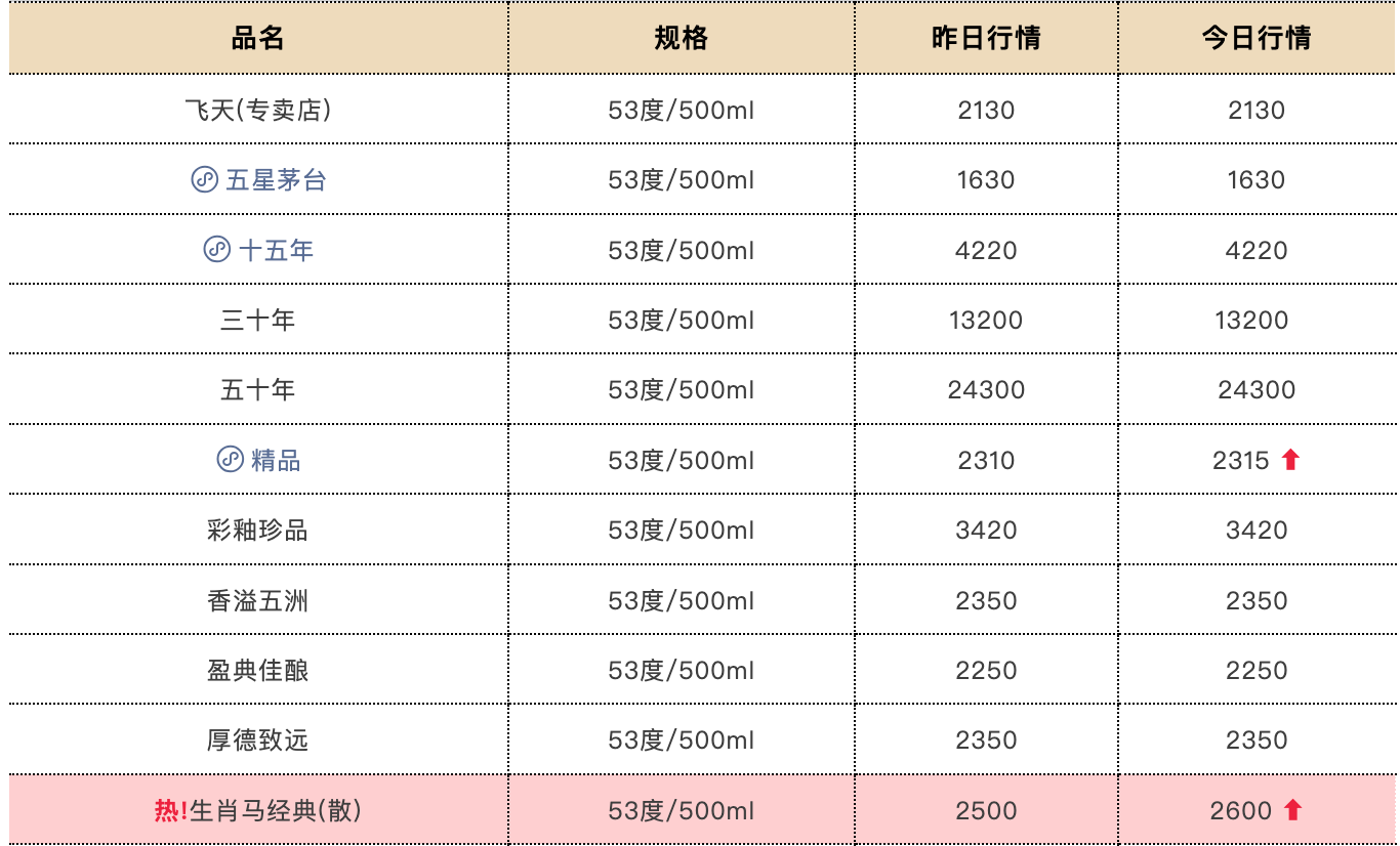 和月初暴跌的行情相比,生肖马经典茅台散装价格也有所回暖,较前一日上涨100元,报2600元/瓶。