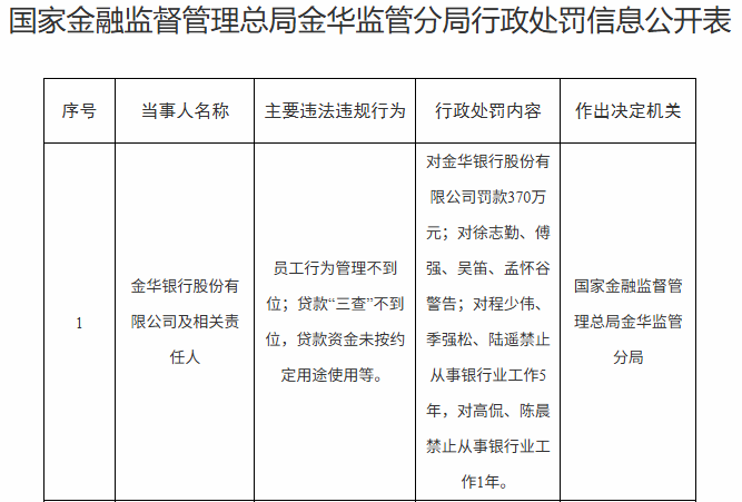 同时,国家金融监督管理总局金华监管分局对相关责任人徐志勤、傅强、吴笛、孟怀谷给予警告;对程少伟、季强松、陆遥禁止从事银行业工作5年,对高侃、陈晨禁止从事银行业工作1年。