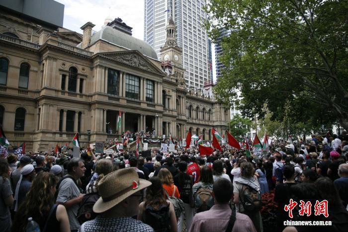 当天傍晚,数千名抗议者聚集在悉尼市政厅外,手持标语、挥舞旗帜,高喊支持巴勒斯坦的口号,并表示澳大利亚“不欢迎”赫尔佐格。记者在集会现场看到,大量警员值守,一架直升机在空中盘旋,骑警在周边区域巡逻。