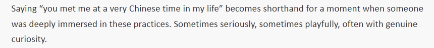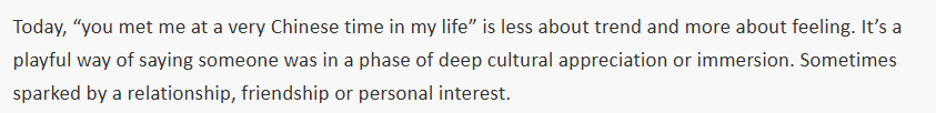 日本英文杂志《大都市》分析说,“你遇见了我人生中‘很中国’的时刻”,便成了沉浸于这类实践的代名词——有时认真,有时轻松,但总带着真诚的好奇。