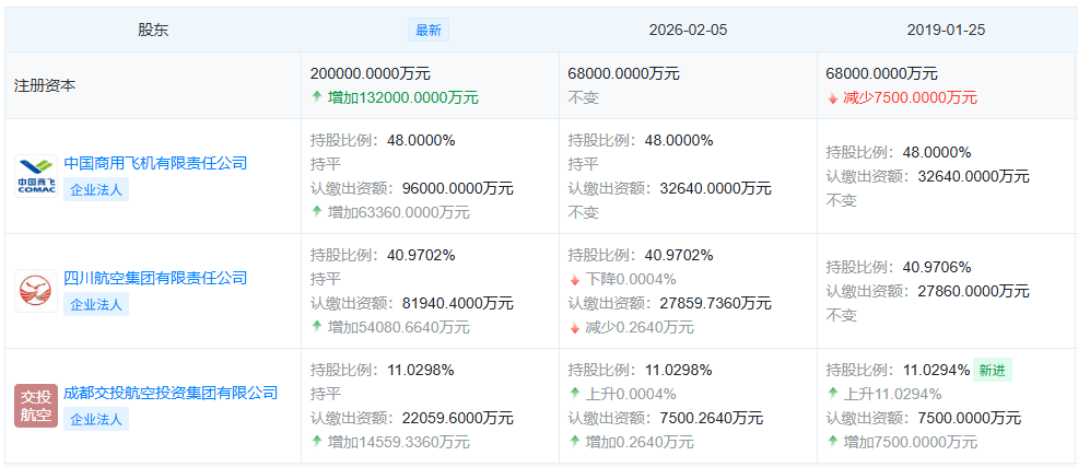 【大河财立方消息】天眼查工商信息显示,近日,成都航空有限公司发生工商变更,注册资本由6.8亿人民币增至20亿人民币,增幅约194%。此次13.2亿增资由中国商飞公司、四川航空集团、成都交投航空投资集团三家股东共同增资。增资后中国商飞仍为成都航空第一大股东。