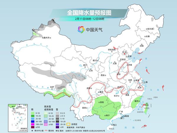 后天,内蒙古东部、黑龙江北部、新疆沿天山地区和南疆西部山区、西藏东南部、川西高原等地部分地区有小雪或雨夹雪,其中,内蒙古东北部、新疆伊犁河谷和南疆西部山区、西藏东部、川西高原南部等地部分地区有中到大雪。贵州、湖南、湖北南部、江西北部、安徽南部、浙江北部、广西西部和北部、台湾岛等地部分地区有小到中雨,其中,湖南中部、贵州东北部等地部分地区有大雨。