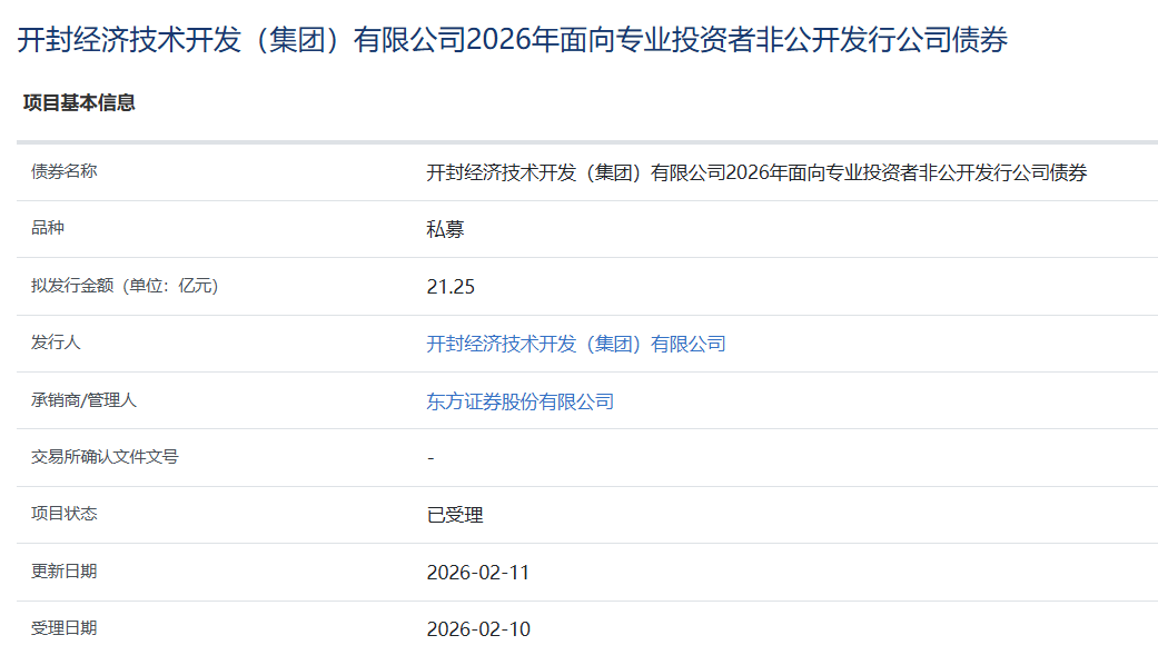 【大河财立方消息】2月11日,开封经济技术开发(集团)有限公司2026年面向专业投资者非公开发行公司债券项目,获上交所受理。
