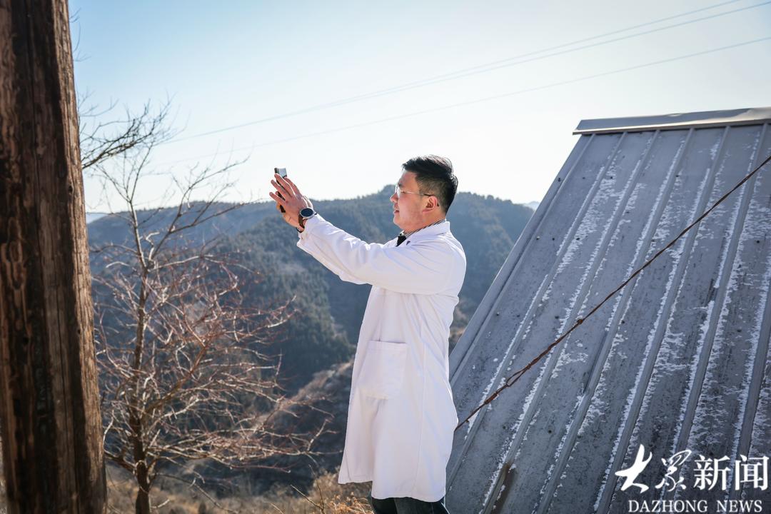 山上信号不好,志愿者刘耀辉正在寻找手机信号。