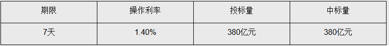 【大河财立方消息】2月14日,中国人民银行以固定利率、数量招标方式开展了380亿元7天期逆回购操作,操作利率1.40%,与此前持平。Wind数据显示,当日无逆回购到期,据此计算,单日净投放380亿元。