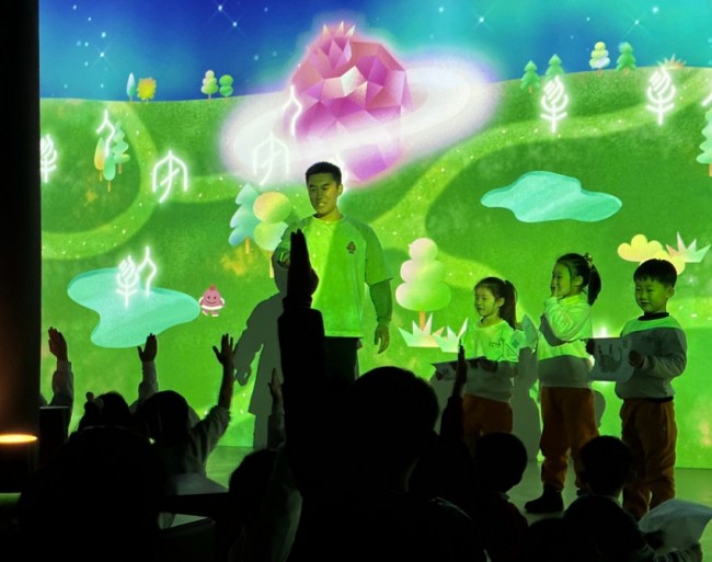 展览呈现的多种沉浸式交互游戏玩法。“甲骨文摸摸墙”,展厅内的巨幕上呈现着精心复原的甲骨文字,观众只需轻轻触摸屏幕上的字符,原本如雨落的甲骨文字便会瞬间“苏醒”,变幻成对应字意的童趣动画。在石榴星球照耀下的风格迥异的各民族元素全部出自小朋友的画笔,画出了童趣,更画出了孩子眼中的石榴精神。交互游戏让沉睡千年的文字通过动画演绎,将造字时的象形思维直观呈现,让观众瞬间读懂古人“观物取象”的造字智慧,原本晦涩的古文字知识在互动中变得妙趣横生。此外,“甲骨文小画家” ,更是将创作权交给观众,观众可以拿起画笔,在精心设计包含甲骨文知识的画纸上为趣味甲骨动物形象涂色,通过数字程序的“翻译”即可实时变成专属动画在展厅的虚拟世界呈现,这种“创作—扫描—融入”的闭环体验,让每个人都成为甲骨文明的“共创者”,在亲手创作中建立与古老文字的情感连接。