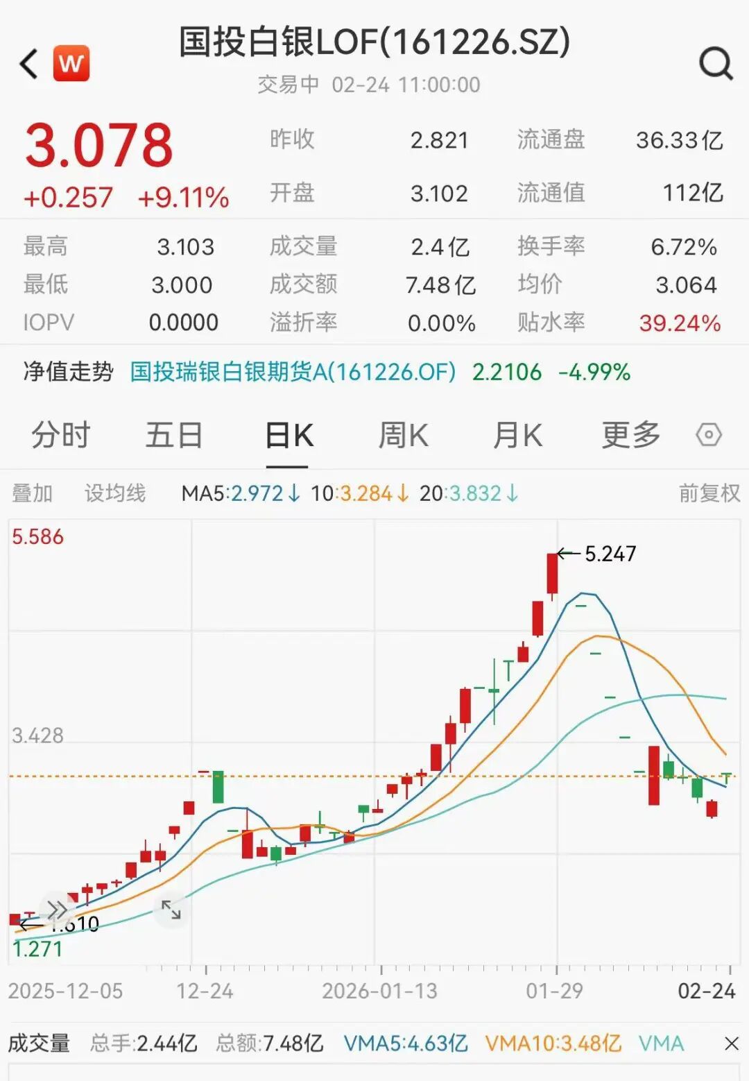【大河财立方消息】2月24日,春节长假后的第一个开盘日,国投白银LOF复牌高开,盘中一度触及涨停,截至11时发稿涨超9%。