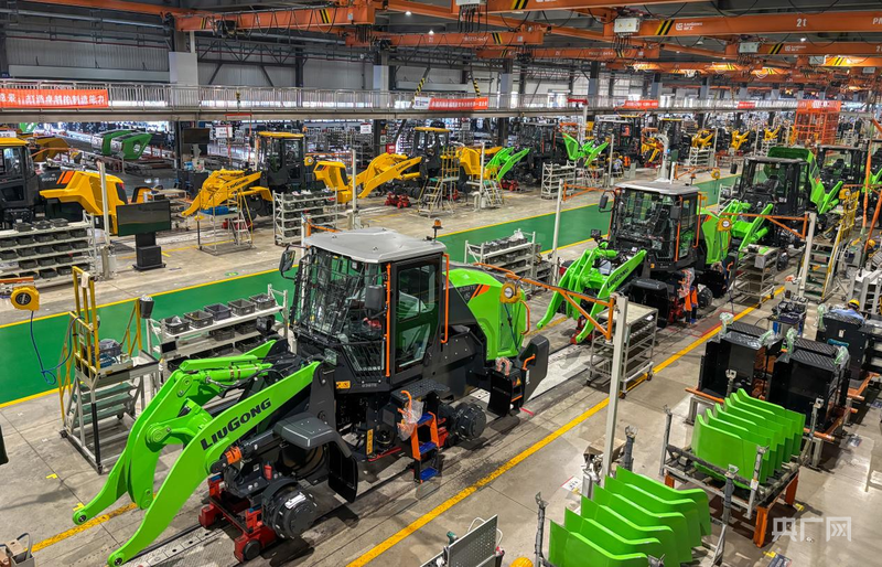 在5G智能工厂,无人电动装载机正在生产线上进行组装(央广网记者 梁瑜琳 摄)