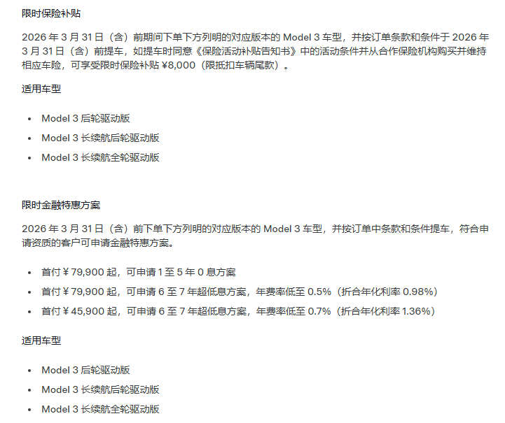 此外,Model 3现行福利还包括限时保险补贴。2026年3月31日(含)前期间下单下方列明的对应版本的Model 3车型,并按订单条款和条件于2026年3月31 日(含)前提车,如提车时同意《保险活动补贴告知书》中的活动条件并从合作保险机构购买并维持相应车险,可享受限时保险补贴8000元(限抵扣车辆尾款)。