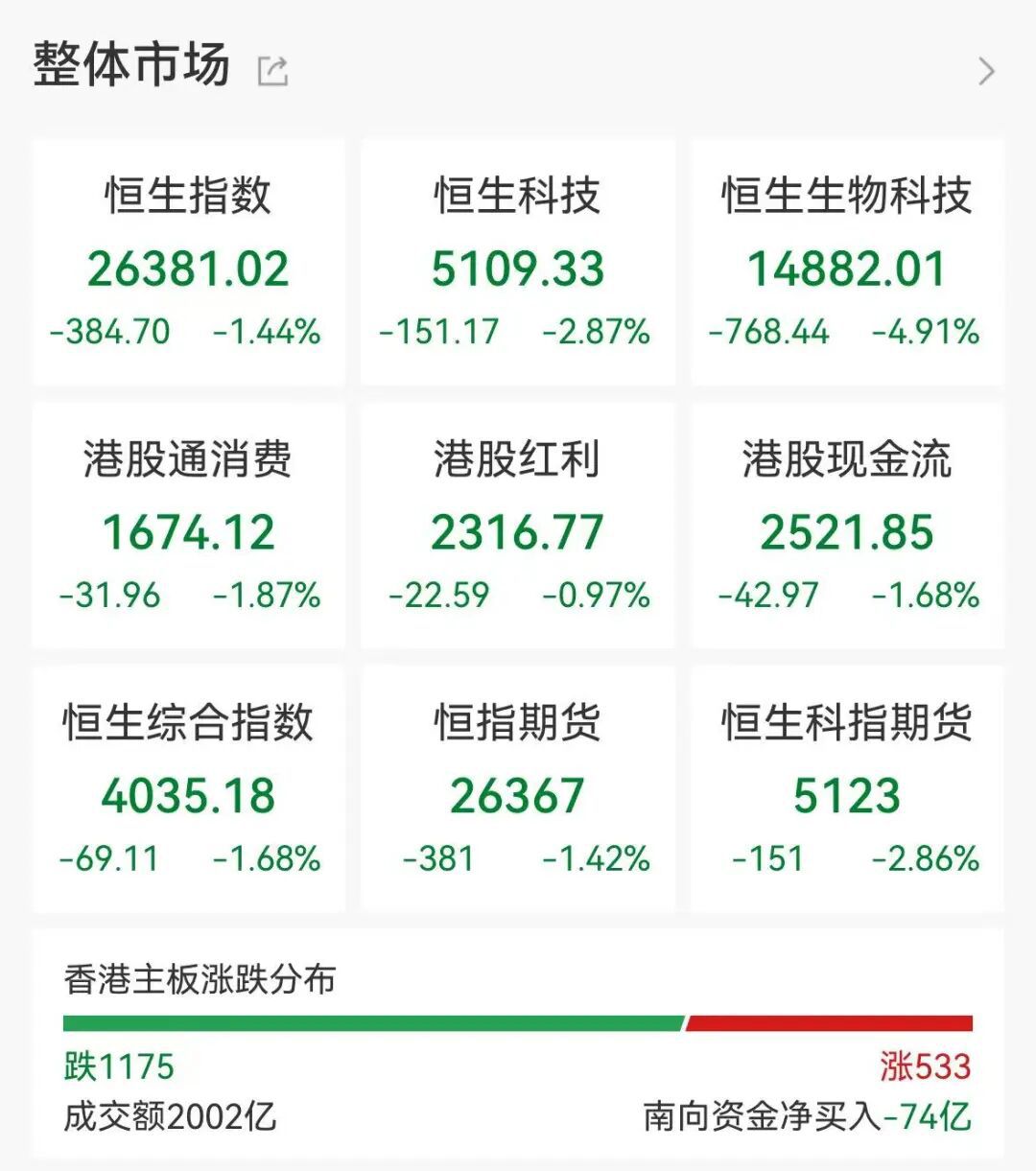 【大河财立方消息】2月26日,港股三大指数集体收跌。恒生指数收跌1.44%,恒生科技指数跌2.87%,恒生中国企业指数跌2.44%。