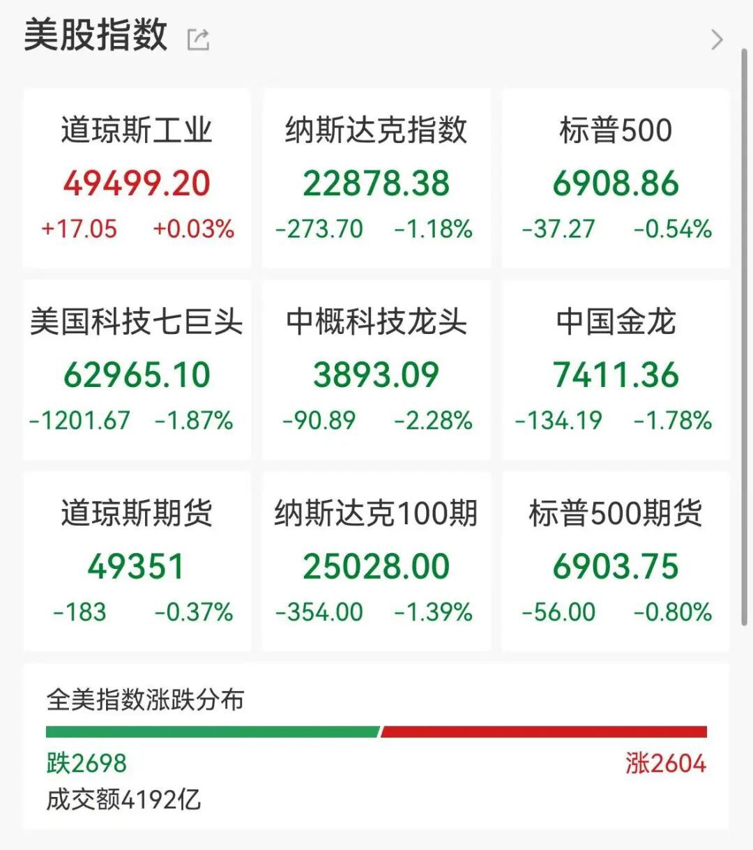 当地时间2月26日,美股三大指数收盘涨跌不一。道指微涨0.03%,标普500指数跌0.54%,纳指跌幅超1%,为1.18%,盘中一度大跌超400点。