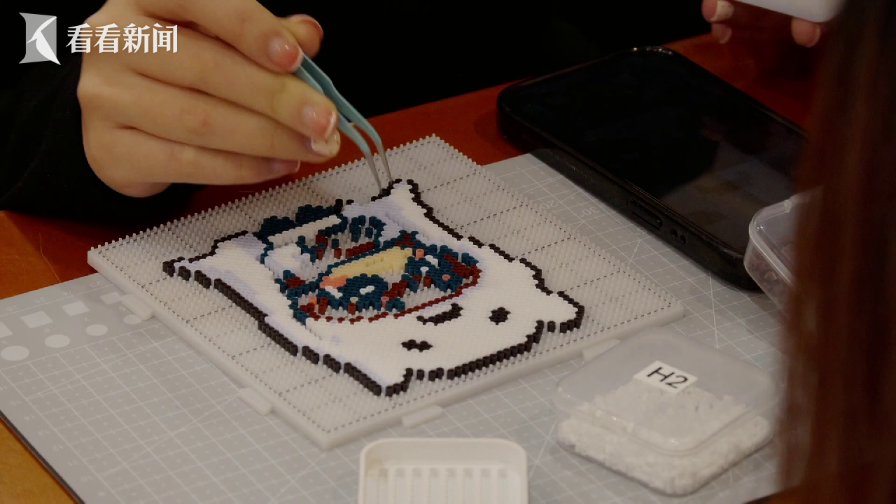 一位刚入坑不久的小姐姐,正对着手机屏幕尝试拼出自己喜欢的动画形象。她说:“因为现在节奏很快,不管你干什么事情,但是拼豆就是可以让你很沉浸,然后很慢地做一件事情,可以做几个小时。”