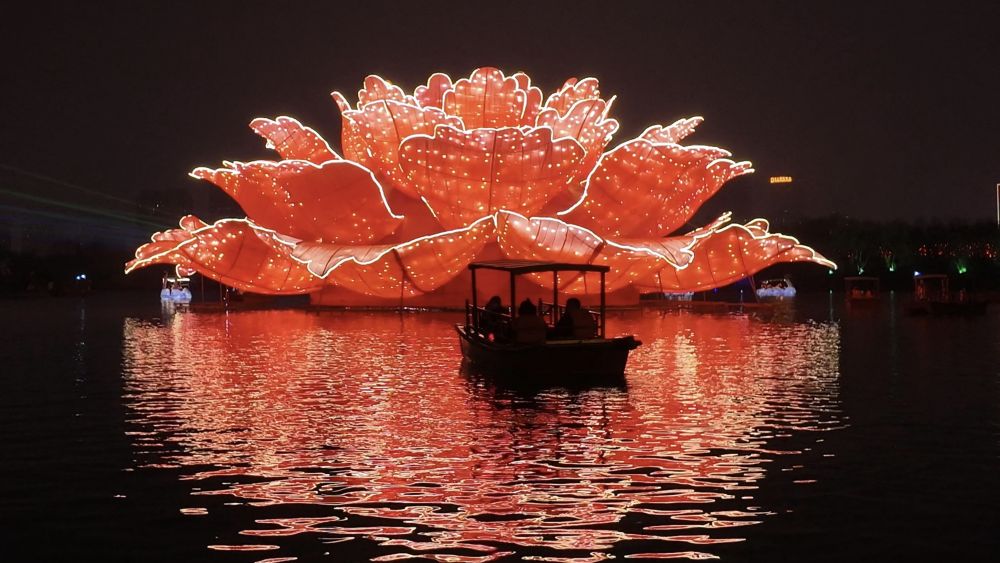 火树银花不夜天。夜色更浓,光影与声浪纷至沓来。隋唐城遗址植物园“水上打铁花”表演如约登场。漫步至滴翠湖北码头,慕名而来的游客早已围在湖边,架好机位、拿出手机和各种“长枪短炮”的拍摄设备,只为记录下铁花飞溅的精彩瞬间。湖中心,一盏巨大的牡丹花灯静静地绽放在水面,与飞溅的铁花互为映衬。