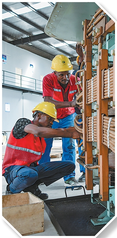 赞比亚工人在位于该国中央省奇邦博市的赞比亚江西经济合作区进行变压器设备维保作业。