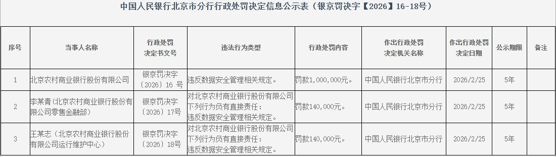 【大河财立方消息】中国人民银行北京市分行近日披露的行政处罚决定信息显示,因违反数据安全管理相关规定,北京农村商业银行被罚100万元,该行零售金融部李某青、运行维护中心王某志对上述行为负有直接责任,均被罚14万元。