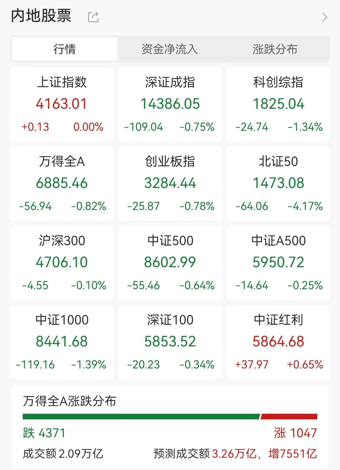 【大河财立方消息】3月2日,A股市场震荡调整。截至午间收盘,沪指率先翻红,深证成指跌0.75%,科创综指跌1.34%,创业板指跌0.78%,全市场半日成交额2.09万亿元,较上一个交易日同时段放量4936亿元。