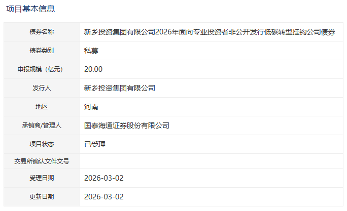【大河财立方消息】3月3日消息,新乡投资集团有限公司2026年面向专业投资者非公开发行低碳转型挂钩公司债券项目获深交所受理。