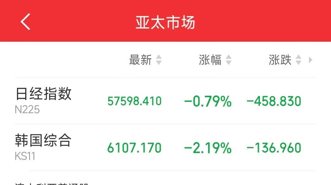 截至发稿,日经225指数跌0.79%,报57598.41点;韩国KOSPI指数跌2.19%,报6107.17点。
