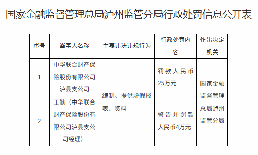 中华联合财产保险股份有限公司泸县支公司经理王勤受到警告并罚款4万元。
