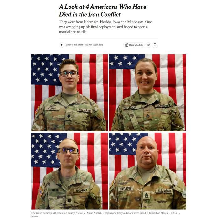据报道,已公布的四名遇难者分别为科迪·A·霍克、妮可·M·阿莫尔、德克兰·J·科迪和诺亚·L·蒂特延斯。袭击中另外两名遇难军人身份尚未公布。